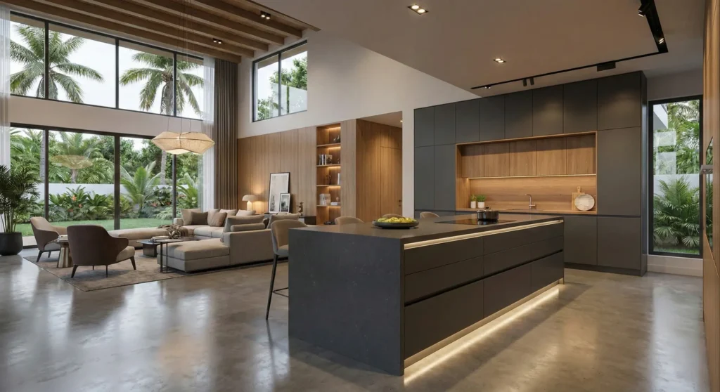- Zonage par le Mobilier : Plutôt que de construire des murs, utilisez un îlot de cuisine monumental en Quartz ou une bibliothèque sur-mesure pour délimiter les espaces sans les fermer.
