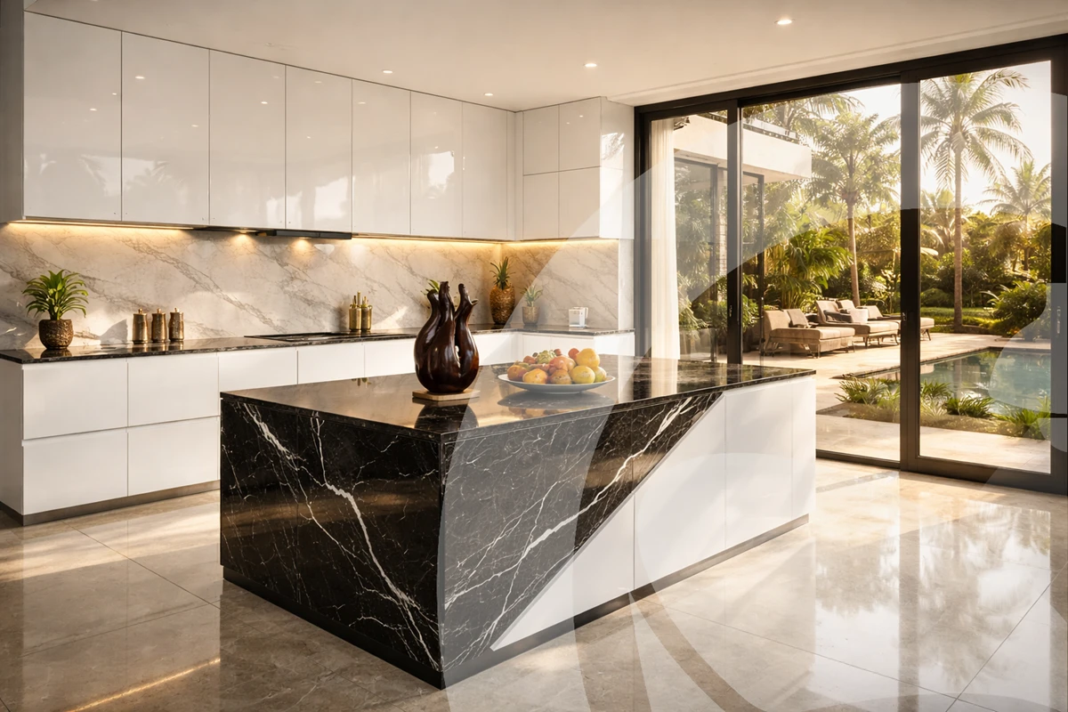 - Protection Anti-UV : Sous notre soleil tropical, beaucoup de cuisines blanches finissent par jaunir. Nos façades acryliques sont traitées pour résister aux rayons ultraviolets, garantissant que votre “Blanc Pur” le restera pendant des décennies.